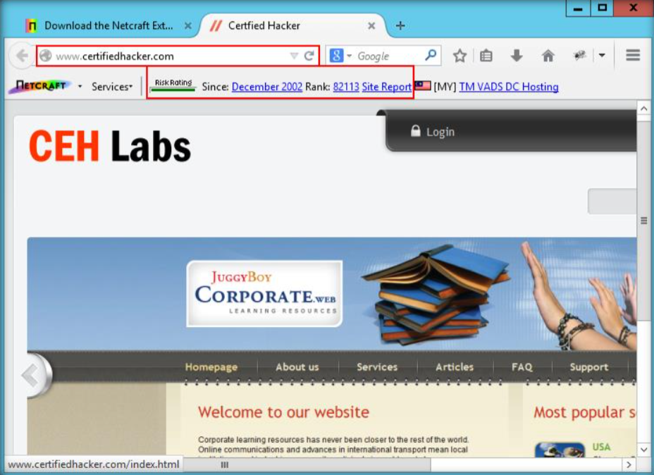 3. To test out, type in the URL bar : www.certifiedhacker.com , press enter to continue. Then certified hacker web page appears and there will be informations such as risk rating, rank, year of the website launched, also flag.