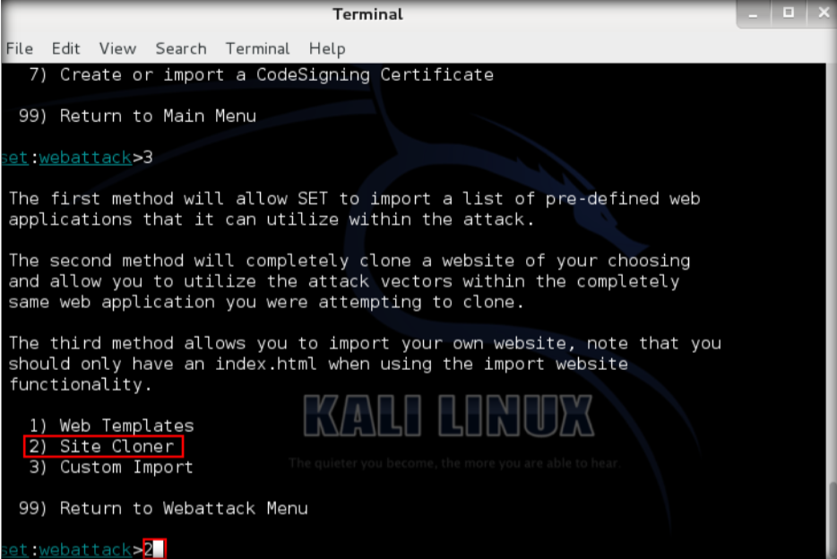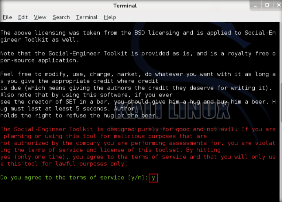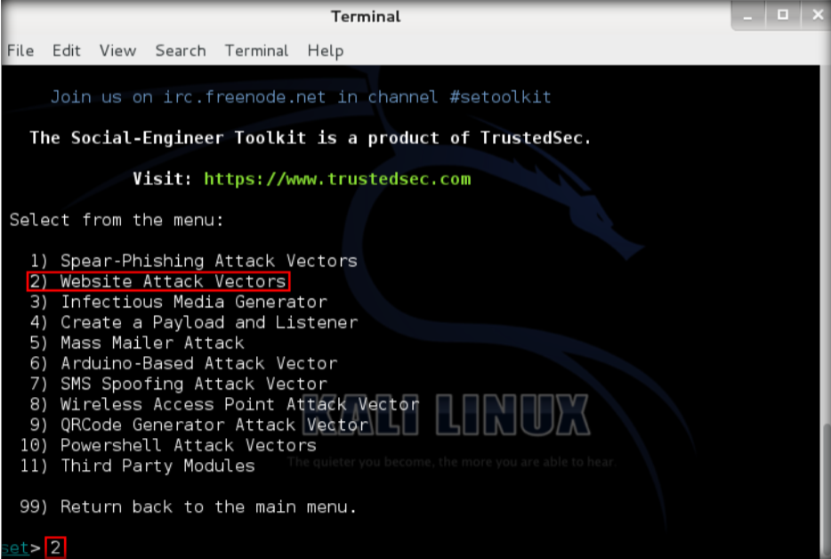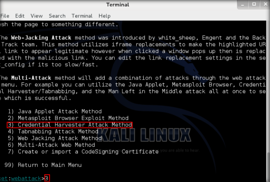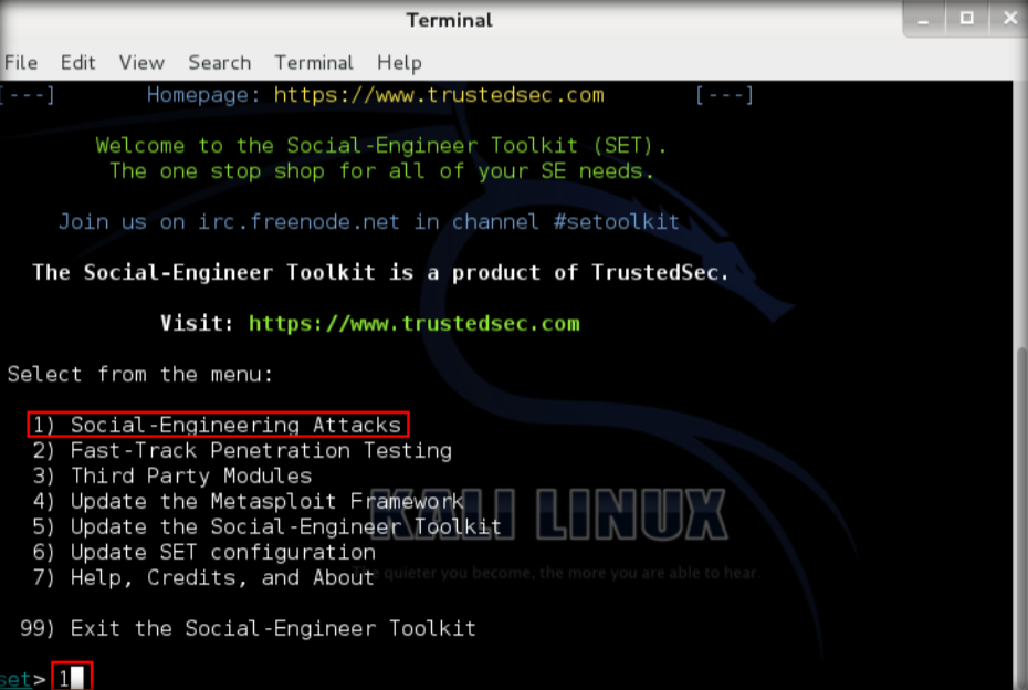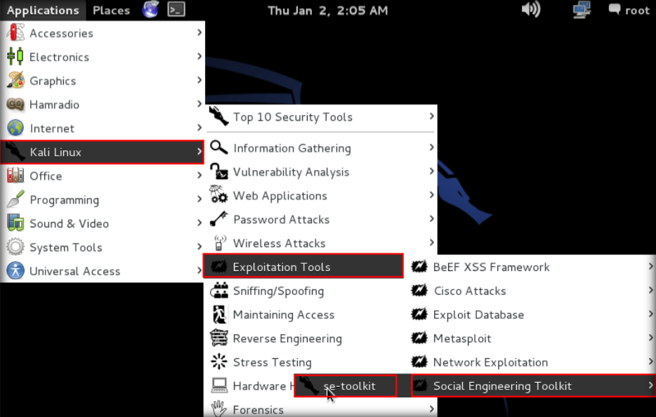1. Open Kali Linux, go to : application – Kali Linux – Exploitation Tools – Social Engineering Toolkit – se-toolkit
