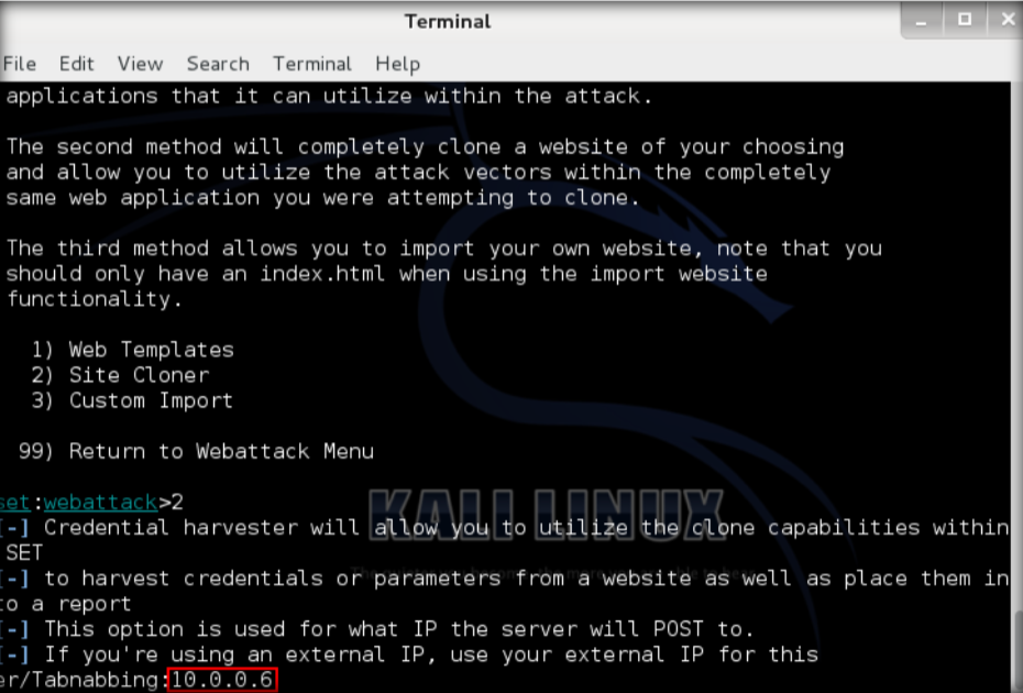7. Type IP address of Kali Linux virtual machine and press enter.