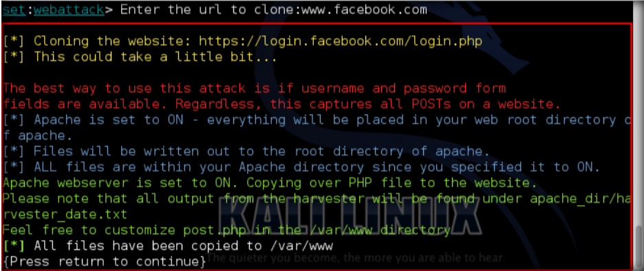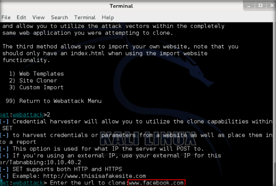 8. Enter the URL to clone. This time, www.facebook.com is the example.