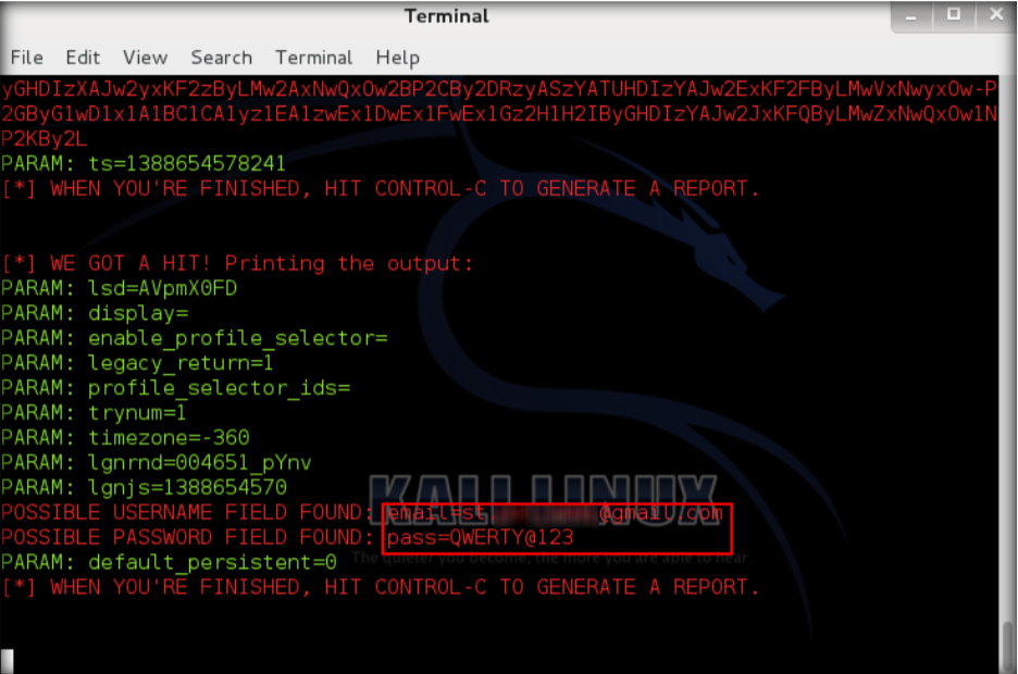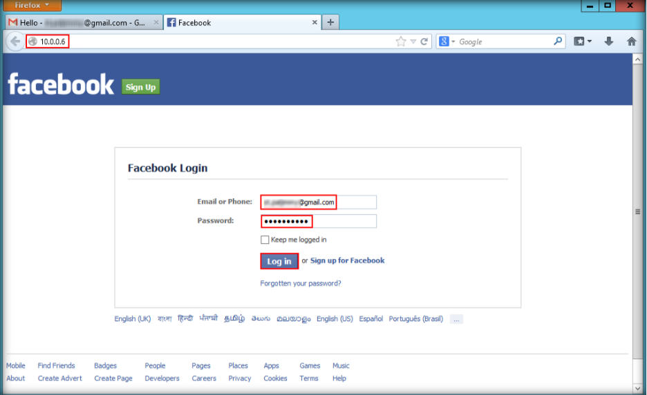 12. Click Log in after fill the email & password, then it will redirect to the real facebook log in page but the email and password data that filled already saved at the set terminal kali linux