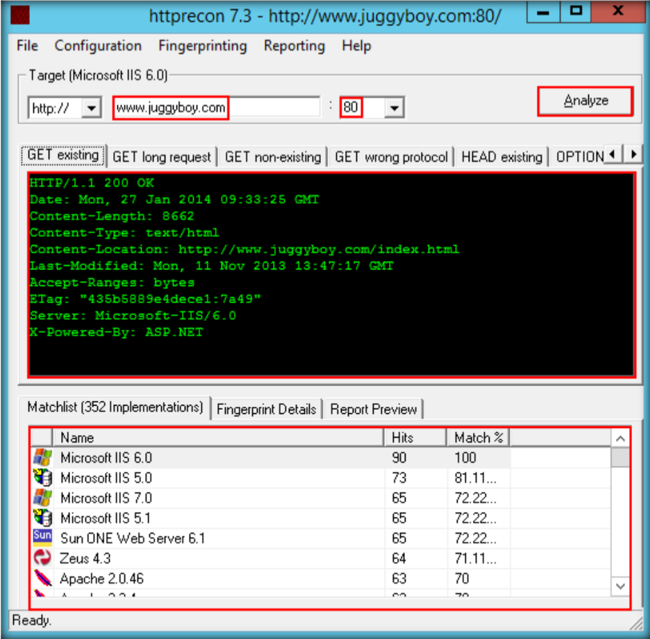 2. Enter website URL that will be footprinted , then select port 80 in target section. Click analyze and footprint result will be shown