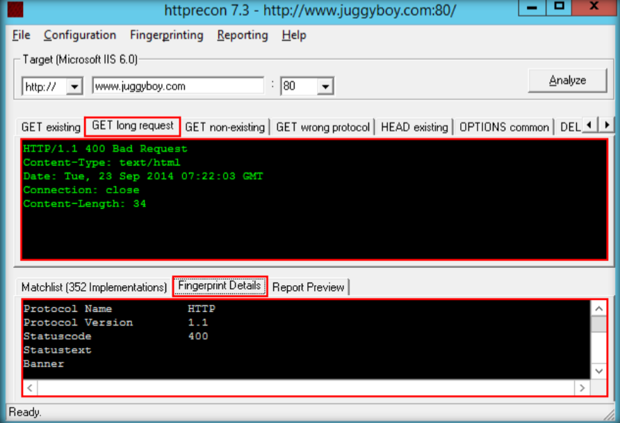 3. Scroll down and observe the server used, version, and the server side used to develop webpages. Click the get long request and fingerprint details