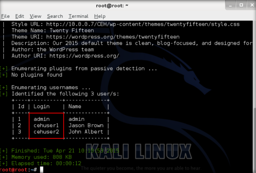 1. Launch Kali Linux then open terminal command line. Type  wpscan –url http://<IP Address>/CEH –enumerate u