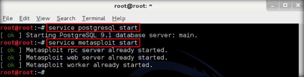 2. After you ensure that the port is open, begin the SYN flooding on the victim. Launch msfconsole, but first start postgresql and metasploit services